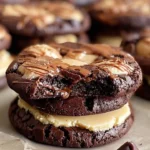 While the cookies cool, it’s time to prepare the luscious peanut butter filling. In a bowl, combine the creamy peanut butter, powdered sugar, and vanilla extract; mix until smooth, creating a heavenly filling that will complement the brownie cookie base. Once the cookies have totally cooled, use your fingers to press down gently on each one to create a flat surface. Place a small dollop of the peanut butter filling on top of one cookie, and then top it with another cookie, creating a delightful sandwich.