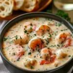 A rich, velvety bisque filled with tender crab and shrimp, perfectly seasoned with aromatic spices, making it a warm and inviting dish.