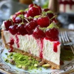 Before serving, top the cheesecake with whipped cream and garnish with whole cherries and chopped pistachios for a stunning presentation.