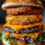 The Ultimate Triple Cheeseburger with Onion Rings is a culinary delight that brings together the decadent flavors of three melty cheeses and crisp, golden onion rings all nestled within a perfectly toasted bun. This burger is not just a meal; it’s an experience that tantalizes your taste buds with every bite. Imagine sinking your teeth into juicy beef patties, supported by layers of cheese and topped with onion rings that provide the crunch factor. It’s comfort food at its finest, designed to satisfy even the heartiest appetites. This recipe offers a rewarding kitchen adventure, perfect for gatherings, weekend barbecues, or a special family dinner. Its impressive stature is sure to turn heads and leave everyone asking for a second helping.